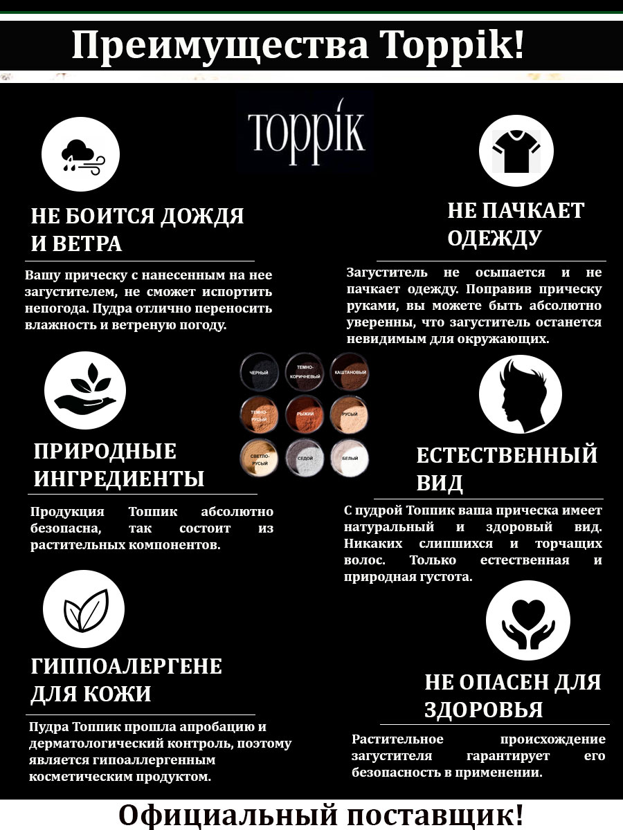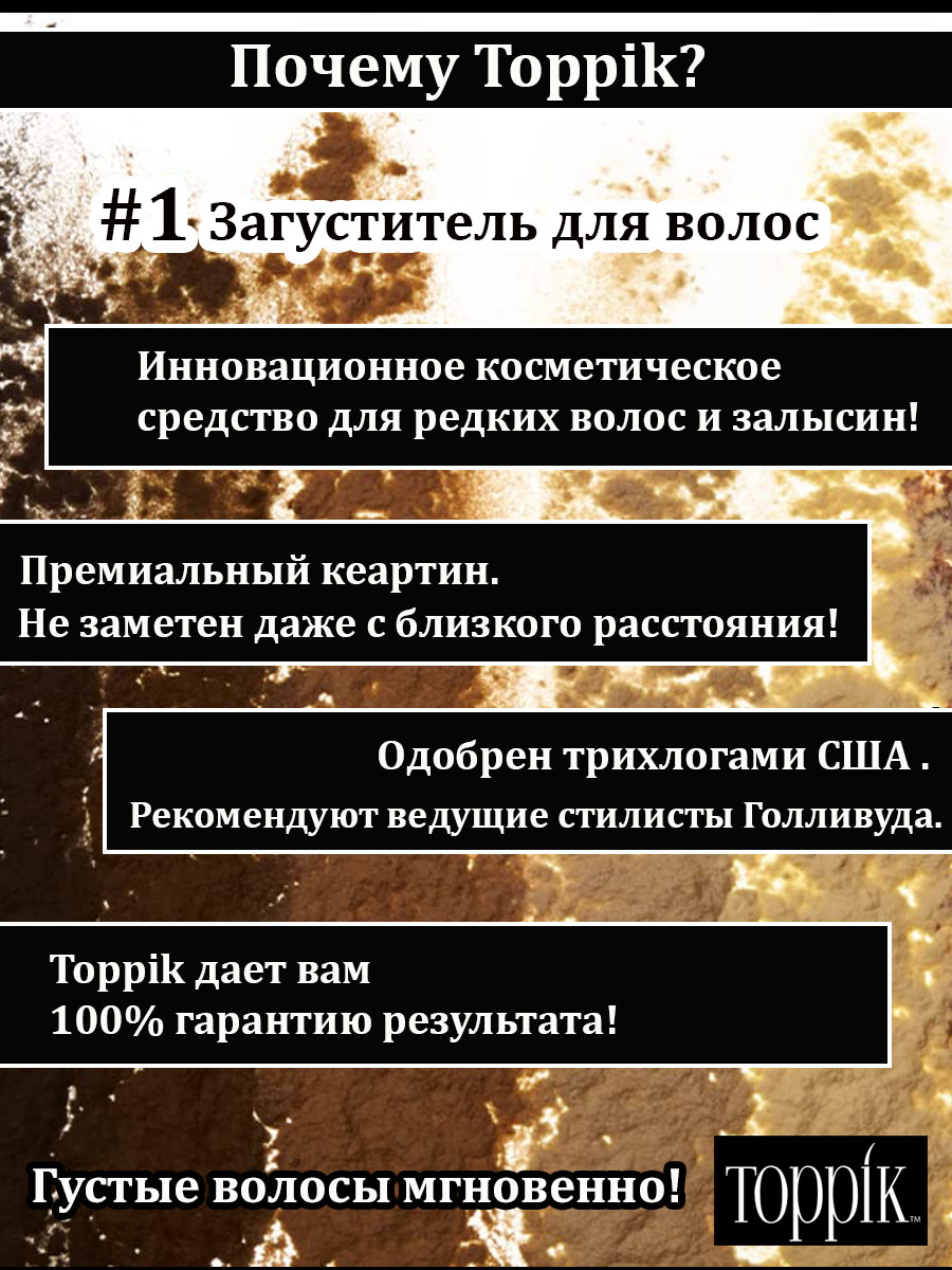 Пудра-загуститель волос (12 Г.)-СТАНДАРТ Toppik является незаменимым инструментом инвентаря любого успешного мужчины! Формула этого средства включает в себя поразительное количество микроэлементов, масел и витаминов, которые питают кожу головы. Обогащение волосяной капсулы кератиновыми пептидами - еще одно значимое достижение загустителя. Пудра-загуститель для волос (12 Г.)-СТАНДАРТ Toppik - Ваше индивидуальное и качественное решение!