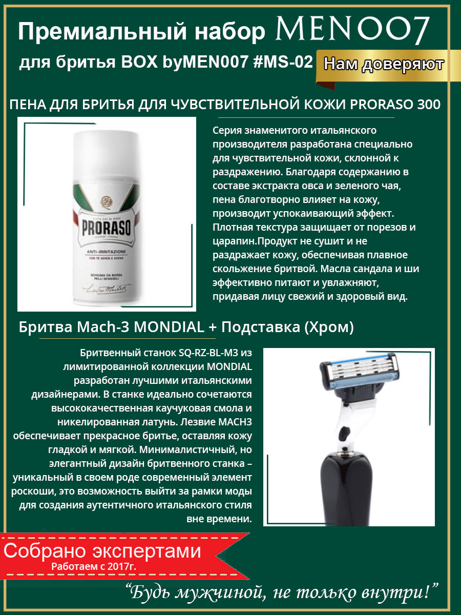 Премиальный набор для бритья итальянского производства понравится мужчине, который ценит аккуратное и приятное бритье. Пена создана специально для кожи, склонной к раздражению. Плотная текстура обволакивает, обеспечивает гладкое скольжение лезвия без раздражения и порезов. Благодаря экстракту овса и зеленого чая, пена эффективно успокаивает кожу. А масла сандала и ши питают и увлажняют, делают лицо свежим, избавляют от сухости. Бритвенный станок из никелированной латуни и каучуковой смолы имеет удобную эргономичную рукоять. Острое лезвие скользит по коже, оставляя ее гладкой с первого прикосновения. Классический дизайн актуален во все времена, а благодаря подставке, бритву удобно хранить в ванной комнате.