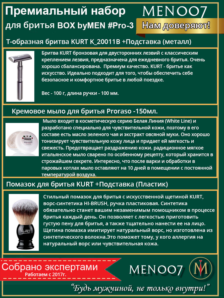 Это идеальный комплект для гладкого бритья, эстетического удовольствия и прекрасного настроения. Стоит начать ежедневную процедуру со взбивания нежного натурального мыла, и уже первые прикосновения доставят истинное удовольствие! Благодаря помазку, мягко массирующему кожный покров, даже самая чувствительная кожа будет наилучшим образом подготовлена к контакту с острым лезвием бритвы, которое не оставит ожогов и порезов. Эффективная формула мыла для бриться с маслом зеленого чая и экстрактом овса, обладает легким, едва уловимым ароматом, который поможет задать тон дню, но при этом не смешается с парфюмом и не будет отвлекать. Оно хорошо тонизирует чувствительную кожу лица и придает ей мягкость и свежесть. Предотвращает раздражению кожи. Тщательно выверенный состав не содержит агрессивных компонентов, не пересушивает кожу, не оставляет ощущения стянутости и сухости. Классический Т-образный станок будет особенно мягко скользить по коже, оставляя ее безупречно гладкой. Лаконичные и практичные подставки для помазка и станка помогут правильно хранить инструменты, и бритье будет доставлять удовольствие каждый день, превратившись в поистине королевский ритуал.